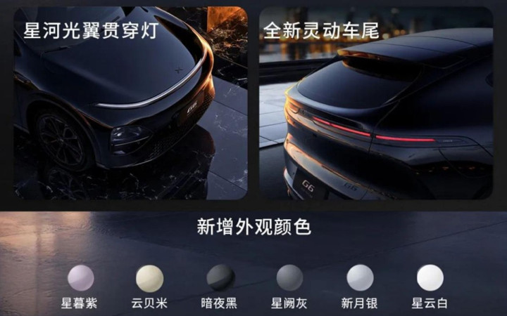最后,新款小鹏G6还新增了6种外观颜色,分别是星幕紫、云贝米、暗夜黑、星阙灰、新月银、星云白。那看完新款小鹏G6在外形上的这些改变,你是否有心动的感觉呢?